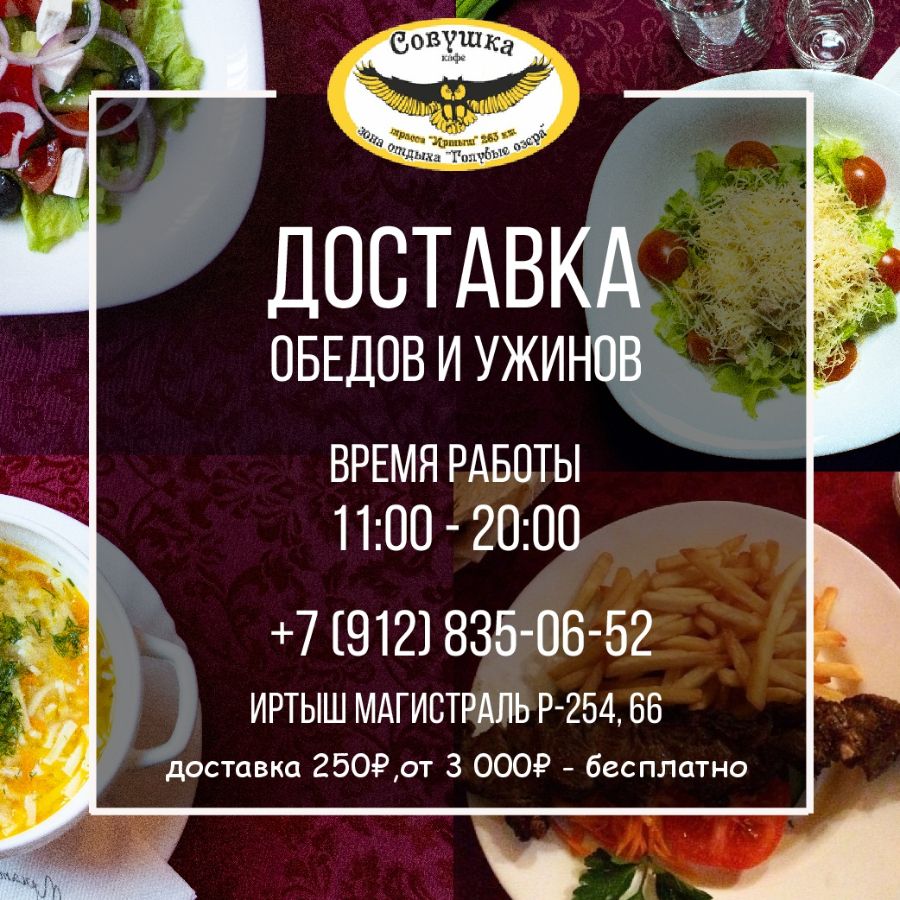 Уважаемые гости кафе " Совушка". В связи с перебоями поставок продукции и нестабильности ценовой политики в стране, возможны изменения в меню. Подробную информацию по ценам Вы можете уточнить по телефону 550-652. Мы готовы к рассмотрению Ваших предложений . Ждем частых встреч. Кафе " Совушка" всегда рядом, всегда рады.